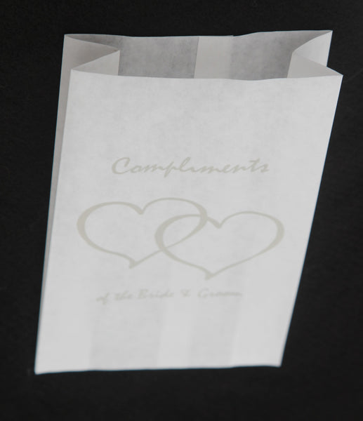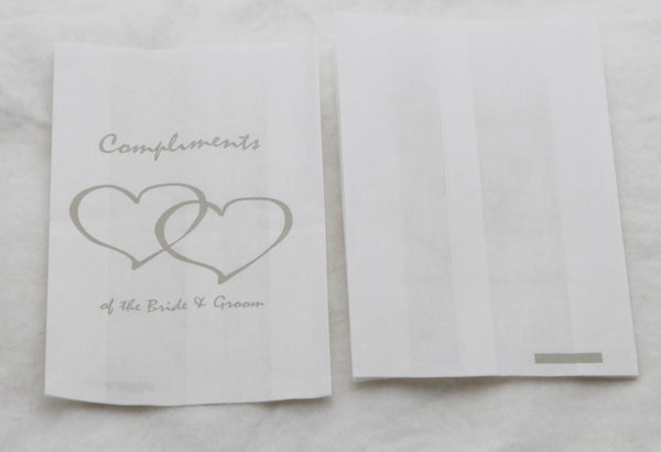 50 individual wedding cake bags with silver heart design and a lovelley touch from the bride & groom. These bags are perfect for gifting your wedding or anniversary cake at your reception for your guests.